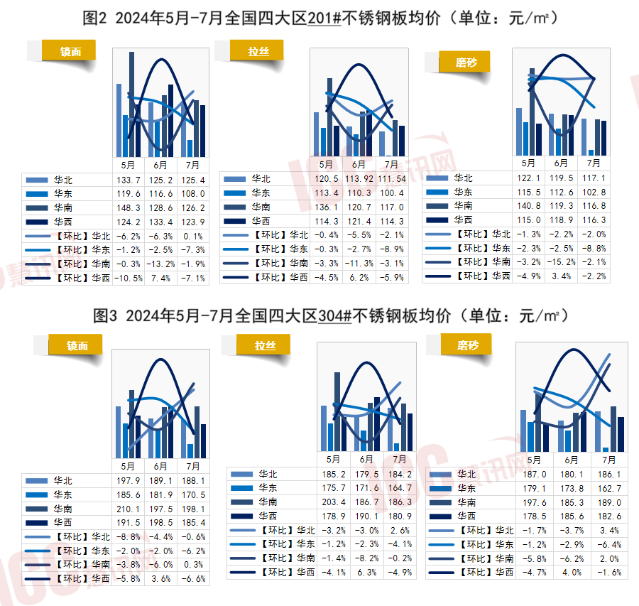 7月份,全国大部分地区的不锈钢板均价呈现下滑趋势,以华东地区的降幅最大。但存在如华北304#拉丝板和磨砂板、以及华南304#磨砂板价格有所上涨,且幅度不低于2%;也存在如华北201#镜面板、华北和华南两地的304#镜面板、以及华南304#拉丝板价格维稳的情况。